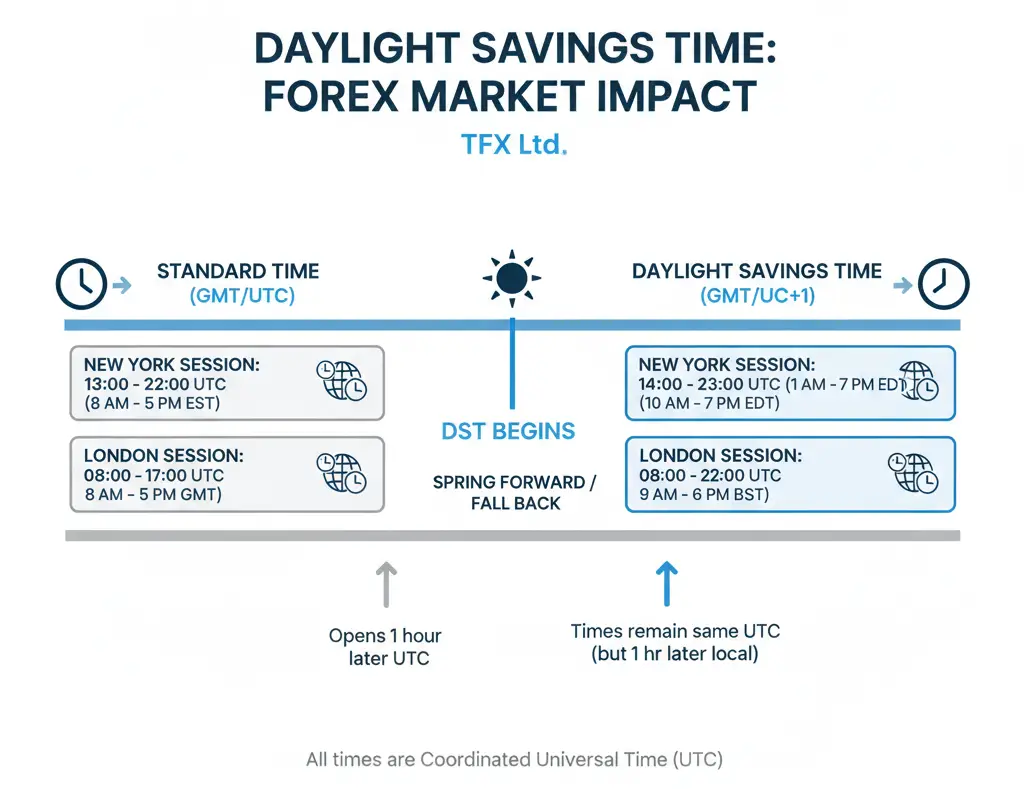 The impact of daylight savings time (DST) in various geographical areas changes the opening times of the forex market. For example, the time difference between New York and London will be affected by daylight saving time. Traders will need to adjust their schedules to make sure they are aware of the timing of the market.