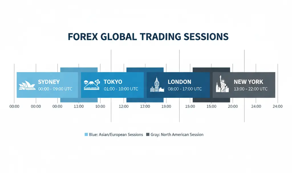 The forex market has four main trading sessions: Sydney, Tokyo, London, and New York, which align with major financial centres. Knowing when these sessions begin and which ones overlap,can help identify the best times to trade. Here is a summary of forex market hours around the world for each session in UTC (Coordinated Universal Time).